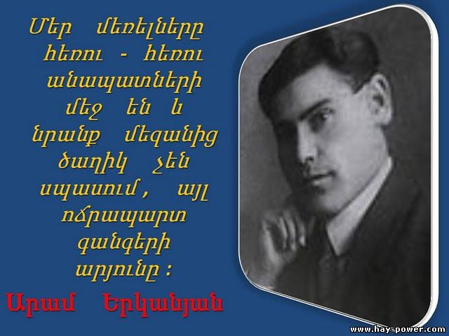 Մեր մեռելները հեռու-հեռու անապատների մեջ են և նրանք մեզանից ծաղիկ չեն սպասում, այլ ոճրապարտ գանգերի արյունը՚: Արամ Երկանյան Հայ վրիժառու բազուկը անհրաժեշտ պահին միշտ իջել է ոսոխի գլխին: Հայոց Նեմեսիսի մեծագույն վրիժառուներից է Արամ Երկանյանը: Երկանյանները Ծոփքից էին` Արևմտյան Հայաստանի Խարբերդ քաղաքից: Ինչպես է նախկինում կոչվել տոհմանունը` ոչ ոքի հայտնի չէ: Հայտնի է միայն, որ […]